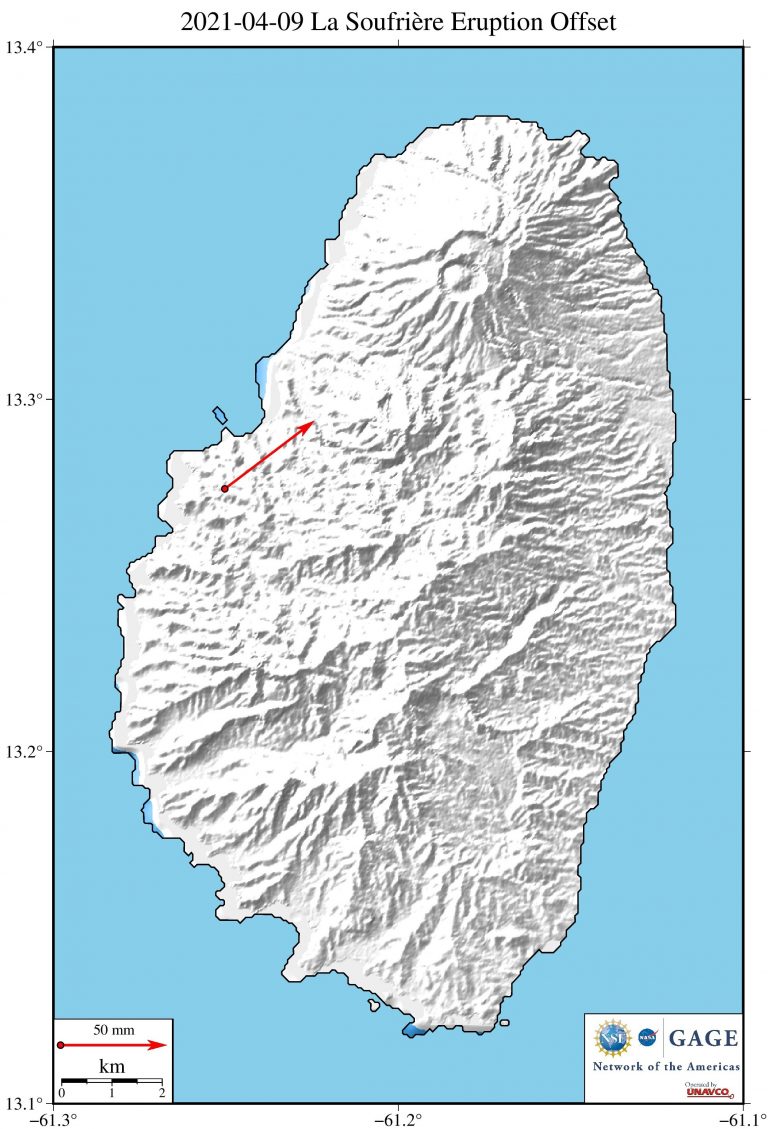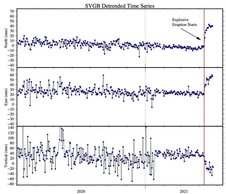 GPS station SVGB—which contributes data to the Network of the Americas—is located on St. Vincent Island as part of a continuous network operated by the University of the West Indies Seismic Research Center. Their analysis of the full network notes: “Since the initial depressurization noted immediately following the April 9 explosive phase, the continuous GPS network has recorded a decrease in the overall rates of horizontal and vertical movement.” A detrended daily time series for SVGB is plotted below, including data through April 24.