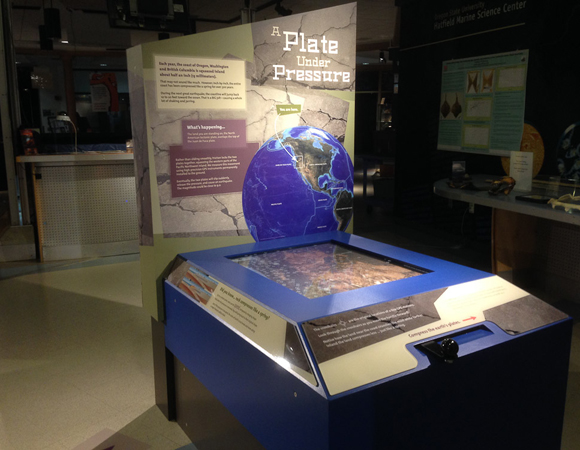 Close up of the “Load…Explode” interactive with a hands-on model to illustrate the interaction of the subducting Juan de Fuca plate with the over-riding North American plate.