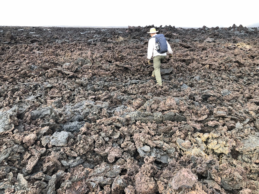 Keith Williams traversing over the treacherous caldera floor of the Sierra Negra volcano. (Photo/John Galetzka, UNAVCO
