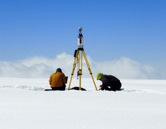 Field work continued on the weather station and snow sampling pits at the research site during low visibility and deep snow. However, clear and calm weather is necessary to acquire the TLS survey data needed for the project. Finally, a brief break in the storm allowed for a short survey and a few days later another break in a storm permitted a complete survey of the glacier surface around the ice core study site.