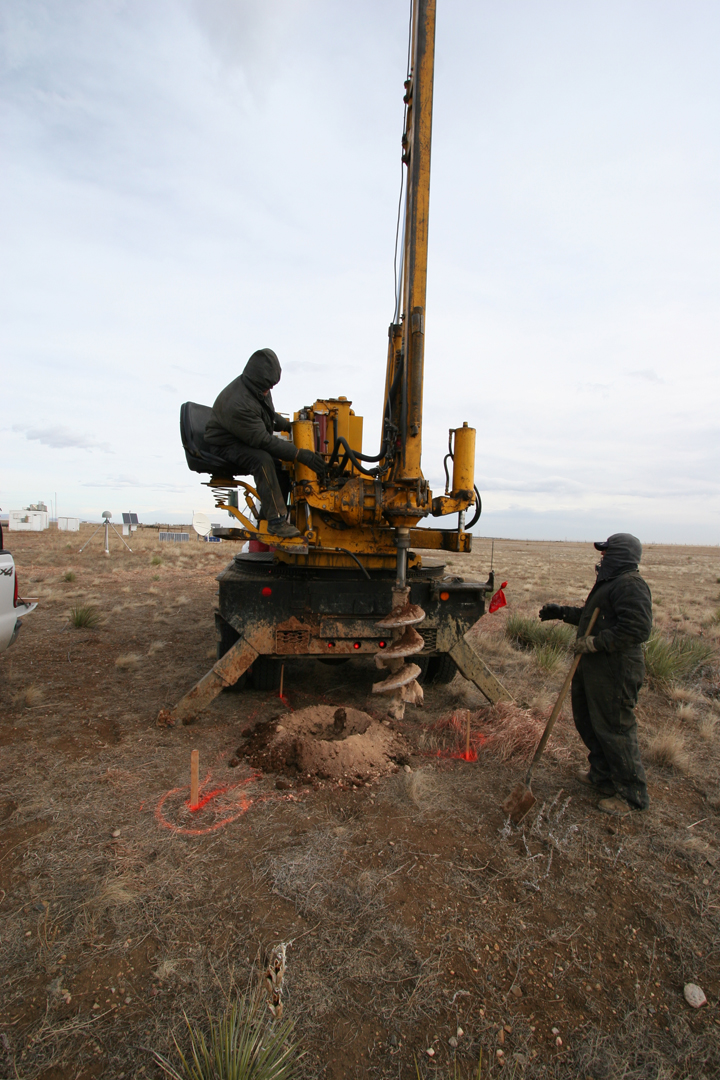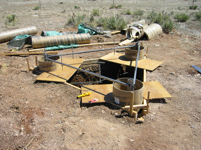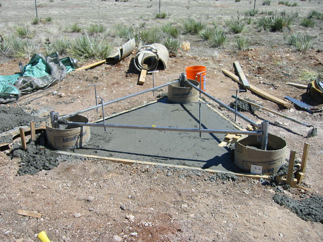 A single concrete (12 inch tube) pillar and a triangular concrete pillar with three marks/mounts were constructed for the test facility. The triangular pillar consists of three 12 inch tubular pillars joined together at the top with concrete and rebar. The triangular section extends one meter below ground and is anchored in the consolidated soil/clay, with roughly two inches protruding above ground. The top of the triangular concrete pillar was then covered with pea-gravel for water drainage and multipath mitigation.