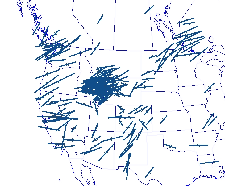 The UNAVCO IDV can display seismic anisotropy or polarization derived from shear wave splitting, with the conventional symbol centered on the location in latitude, longitude, and elevation. Splitting azimuth and delay are shown at each station as bars aligned with the fast direction and bar length scaled by time delay.