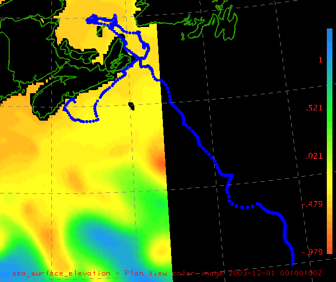 Sea turtle track (positions as points or dots, animated by time) with 2d sea surface elevation data (data provided by Maswood Hasan Mostafi, Dalhousie University). Click for larger image.